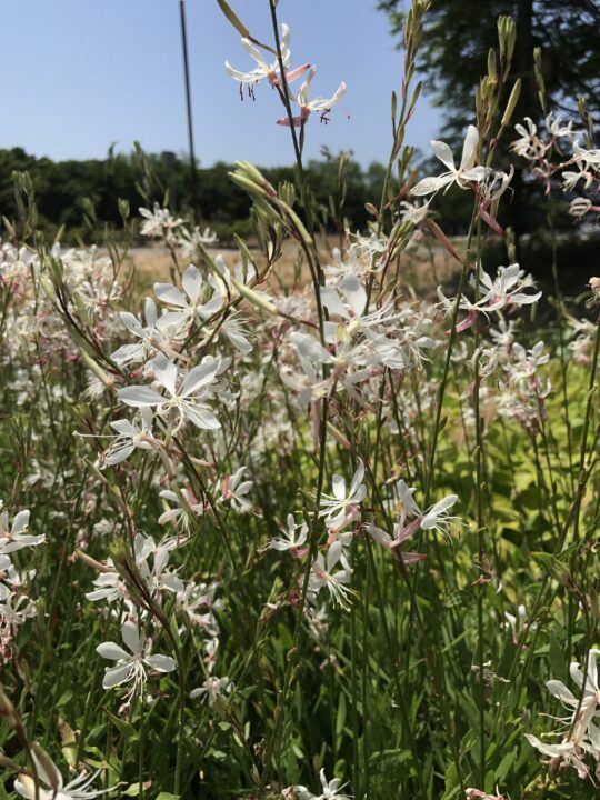 別名ハクチョウソウ(白蝶草)。花茎がしなやかで風に白い蝶が舞うように揺れ、花壇に動きを与える。花期が長く、切り戻しても次から次へと花を咲かせる。エキナセアのような丸いフォルムの花と組み合わせると質感の違いがお互いを引き立てる。乾燥にも耐え、酷暑も乗り越える。